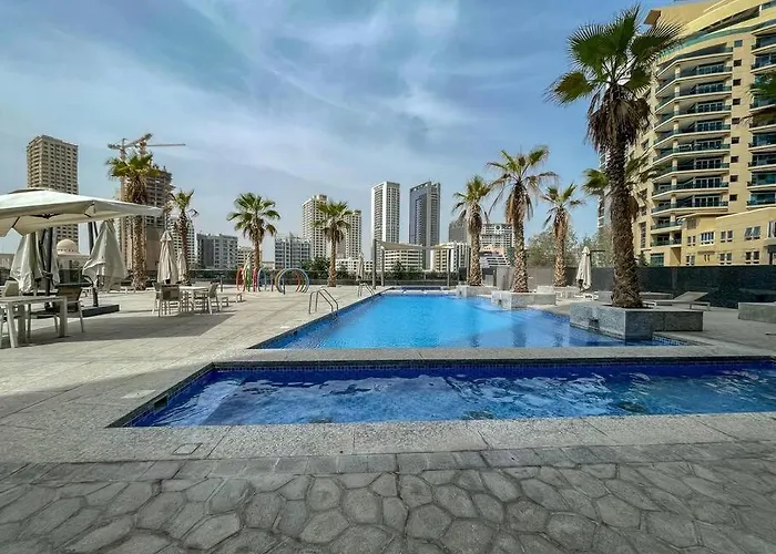 Lush Tropical Getaway In Dubai Marina Apartment offers guests a balcony and a dressing area and overlooks the pool. The property includes a separate toilet for your comfort. Hair dryers are also included in the bathroom.